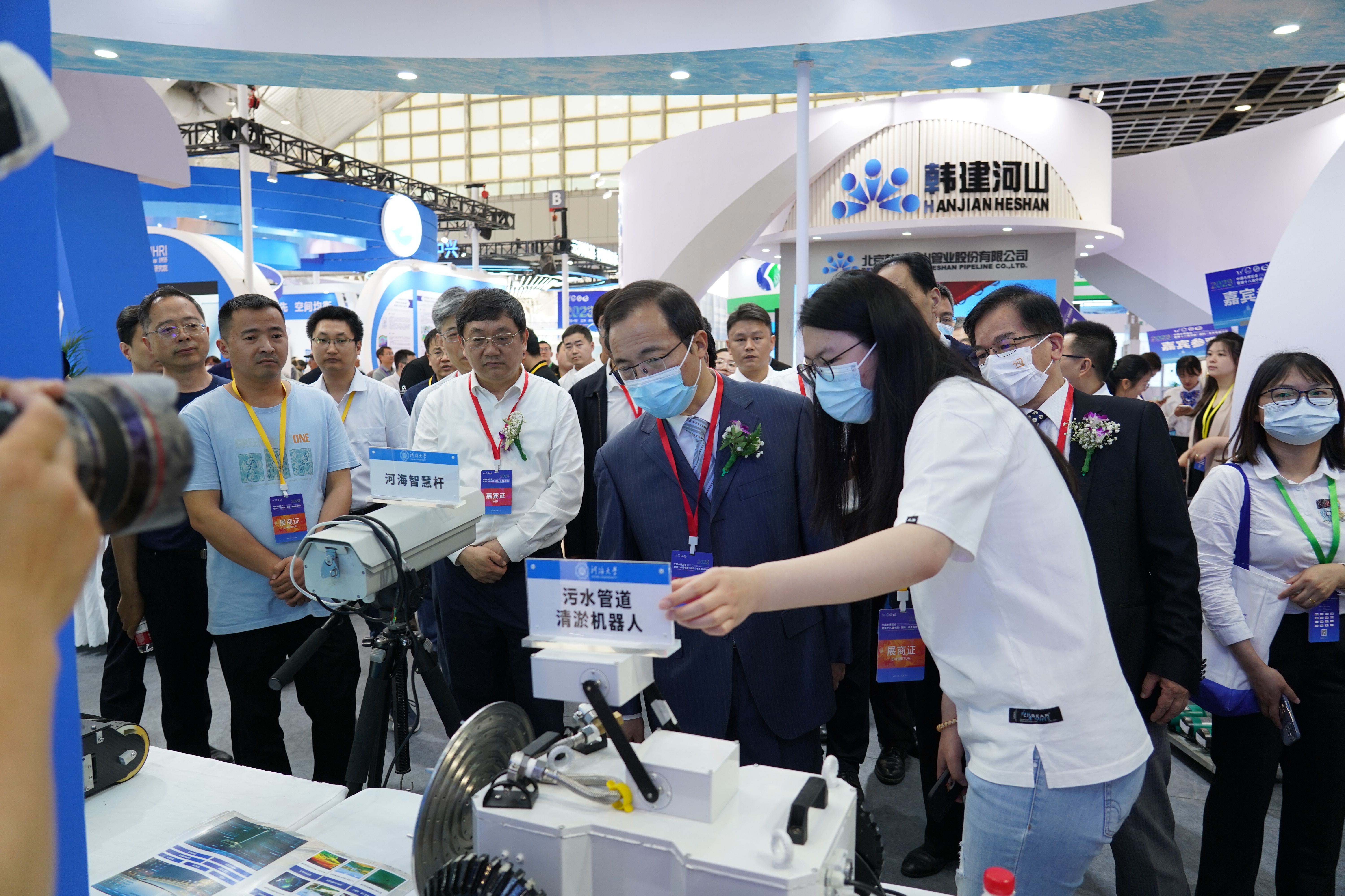 本次水博览会,学校精心遴选参展的全球水文仿真与智能分析系统、输水廊道缺陷检测系统、爬壁机器人、苦咸水淡化设备、机器视觉智能测量系统、河海智慧杆、污水管道清淤机器人、水质光谱在线监测与预警技术等亮点科研成果收获了极高的关注。水利部原副部长、应急管理部原副部长周学文等领导也亲临河海大学展位参观指导。