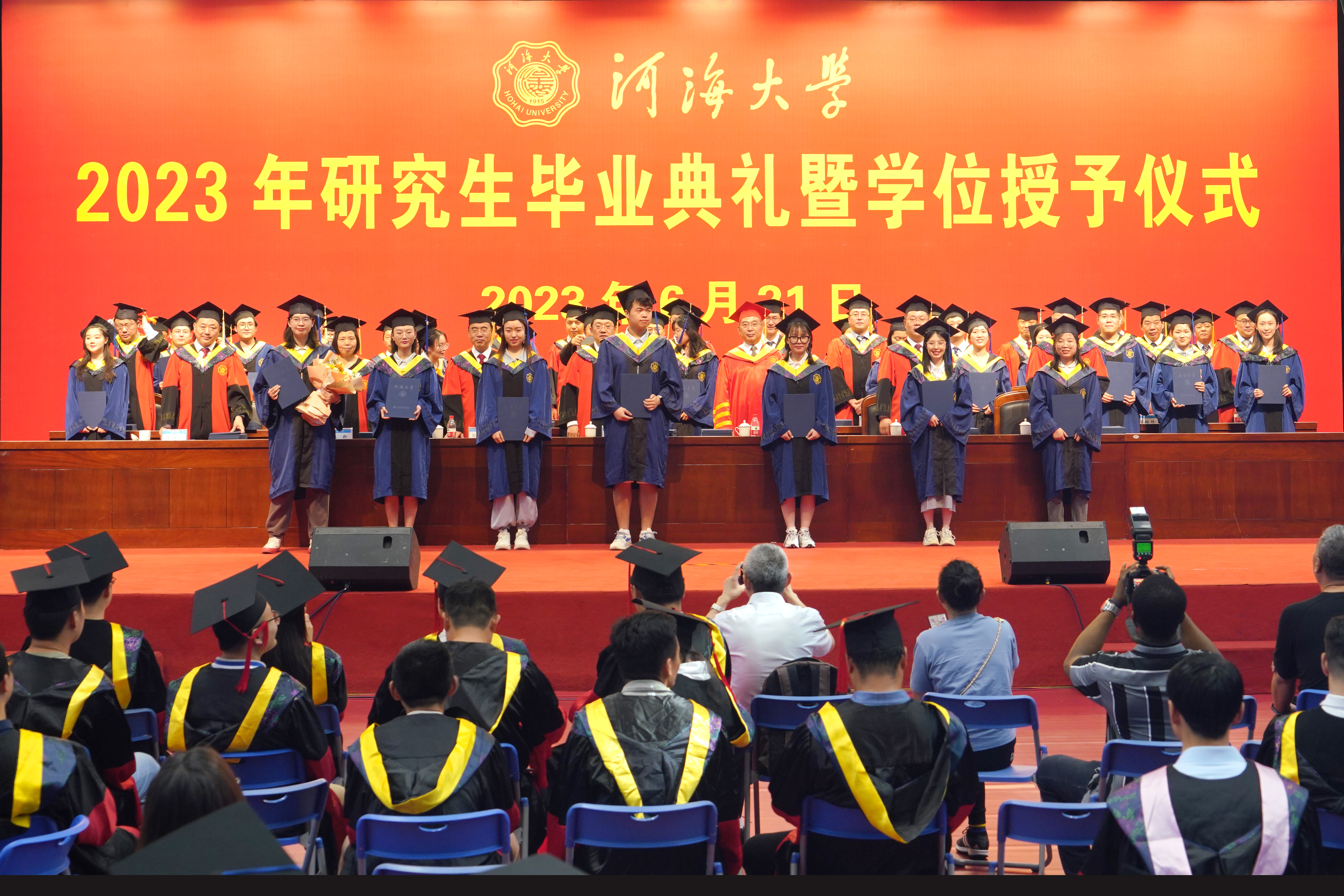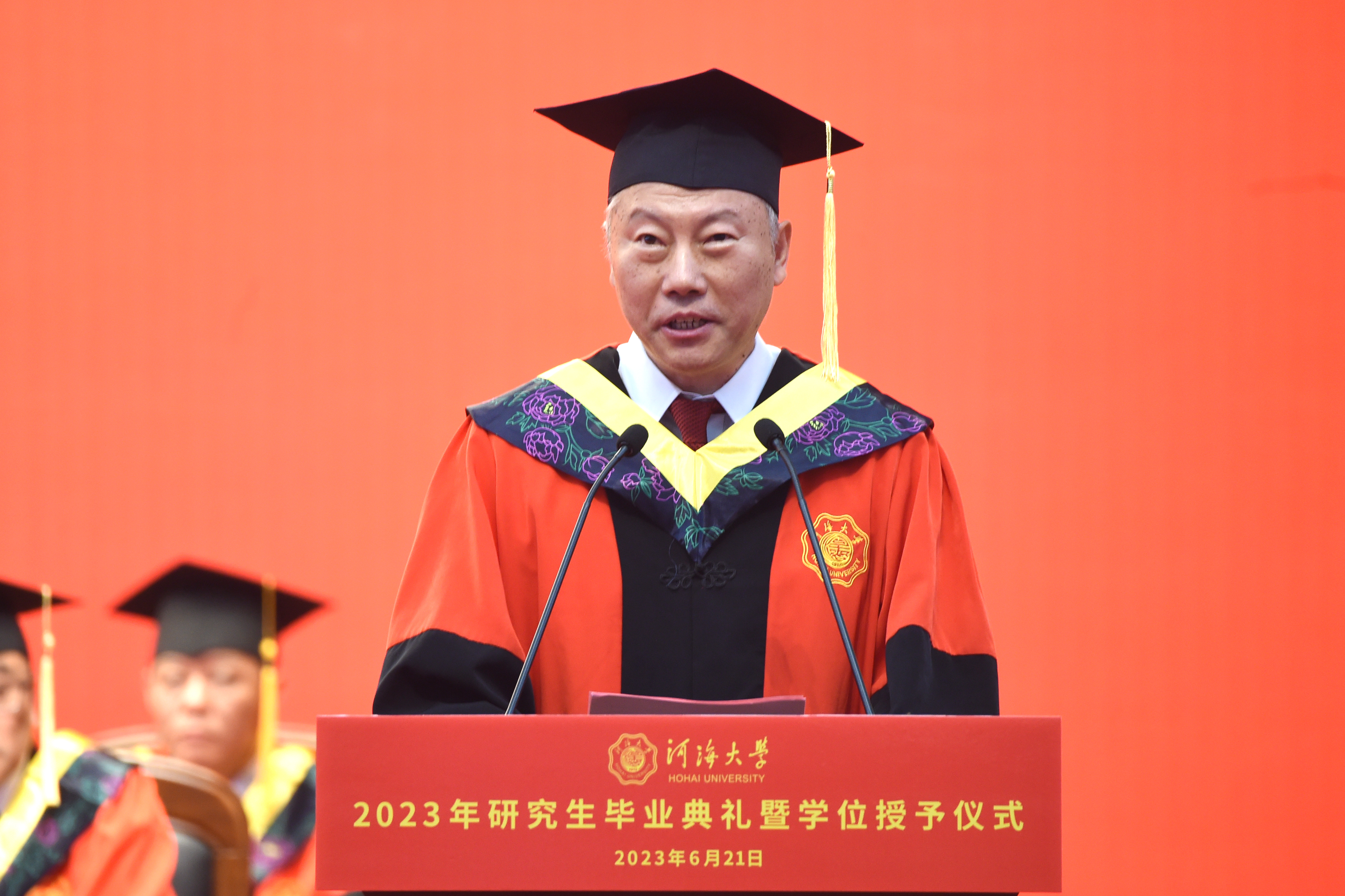 6月21日,河海大学隆重举行2023年研究生毕业典礼暨学位授予仪式。中国工程院院士、河海大学杰出校友、河海大学荣誉教授徐祖信作为特邀嘉宾出席典礼。校党委书记、中国工程院院士唐洪武,校长、校学位评定委员会主席杨桂山,常务副校长李俊杰,校党委副书记郭继超,校党委副书记、纪委书记孟新,副校长许峰,副校长陆国宾,各学院(学部、系)及相关部门负责人,研究生导师代表和全体毕业研究生参加了典礼。李俊杰主持典礼。