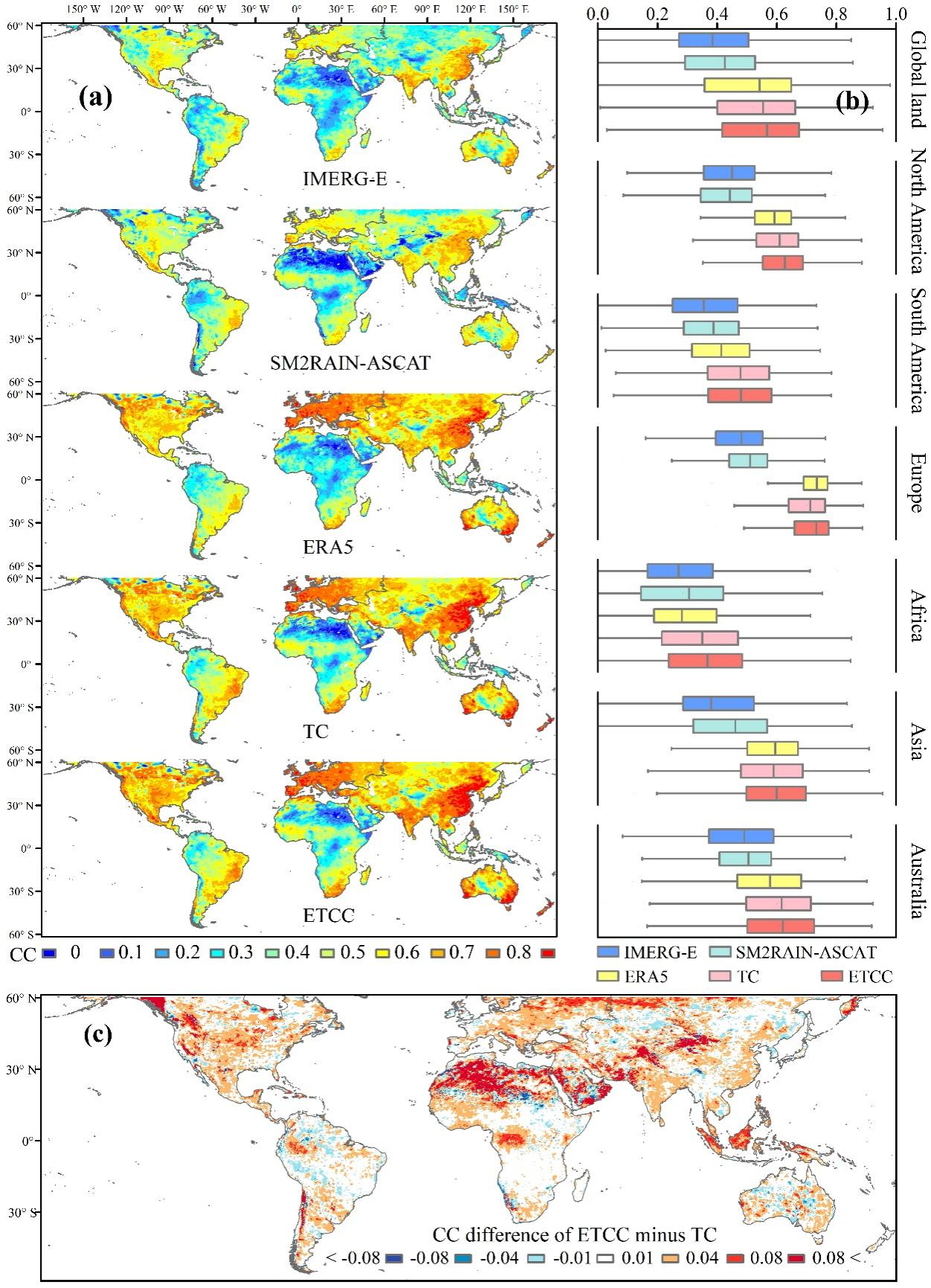 图2 IMERG-E、SM2RAIN-ASCAT、ERA5、TC融合降水和ETCC融合降水与CPC在全球大陆的相关系数(CC)空间分布和箱形图