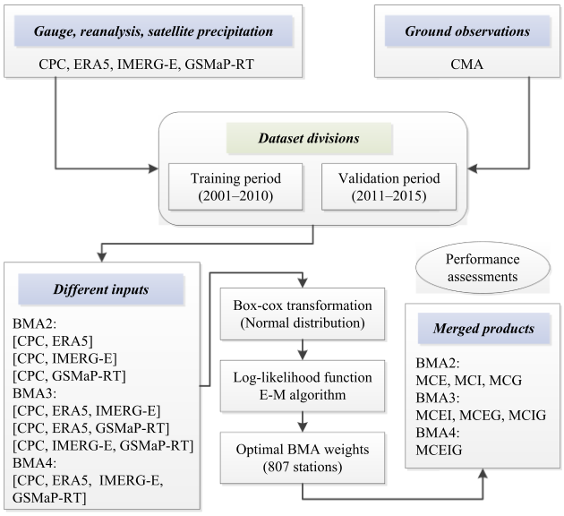 Wei, L., Jiang, S., Dong, J., Ren, L., Liu, Y., Zhang, L., Wang, M., Duan, Z., 2023. Fusion of gauge-based, reanalysis, and satellite precipitation products using Bayesian model averaging approach: Determination of the influence of different input sources. Journal of Hydrology, 618, 129234. https://doi.org/10.1016/j.jhydrol.2023.129234