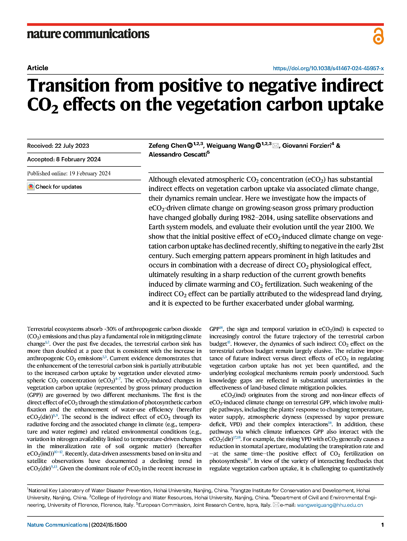 河海大学王卫光教授为论文通讯作者,其指导的博士陈泽峰为第一作者。成果由我校联合意大利佛罗伦萨大学、欧盟委员会联合研究中心等知名高校和科研院所共同完成。