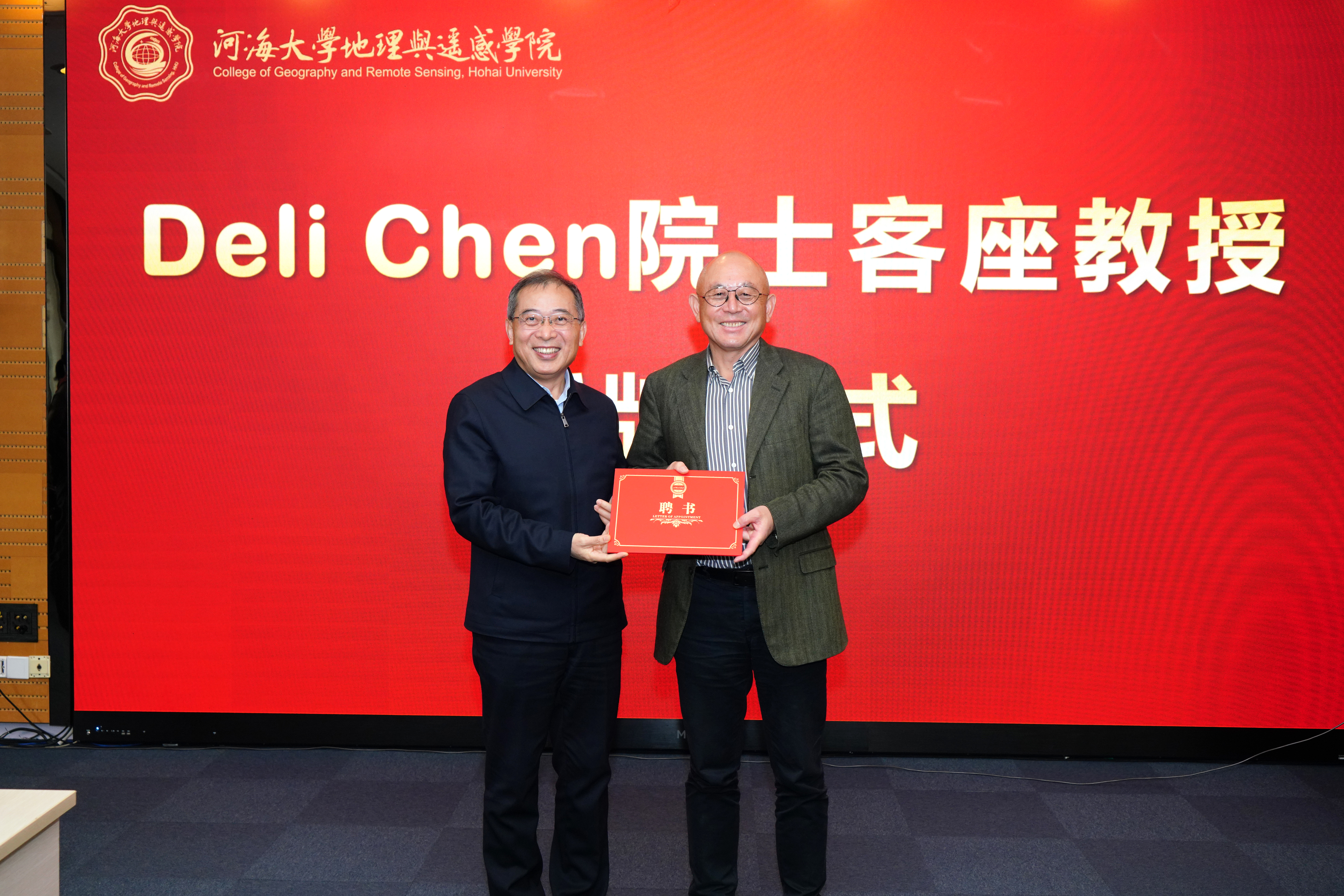 杨桂山为陈德利院士颁发客座教授聘书。他表示,陈德利院士的加盟是学校深入实施“人才强校”战略的重要成果,为学科建设、人才培养和国际化交流注入强大动力。依托陈德利院士的的学术引领力与行业影响力,学校将进一步强化流域地理学特色优势,聚焦流域水安全、生源要素循环、生物多样性保护等关键方向开展系统性创新研究,持续提升服务国家粮食安全与生态文明建设战略需求的贡献能力。